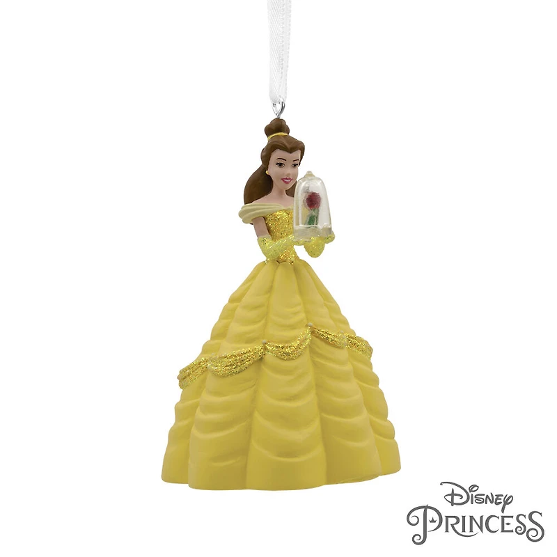 La princesse Belle, de La Belle et la Bête, porte une robe de bal jaune et désire faire une entrée spectaculaire sur votre sapin de Noël ! Elle tient la rose éternelle sous cloche.