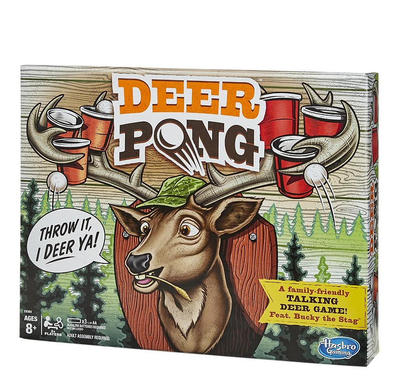 Un chevreuil parlant et musical anime la partie alors que les équipes font la course pour lancer 3 balles dans les gobelets. Les fous rires seront au rendez-vous lorsque M. Chevreuil ouvrira la bouche pour commenter les talents de tir des joueurs ou pour lancer toute autre plaisanterie. On passe en mode Blagueur pour entendre des phrases et des blagues insignifiantes. Deer Pong plaira à toute la famille. À partir de 8 ans.