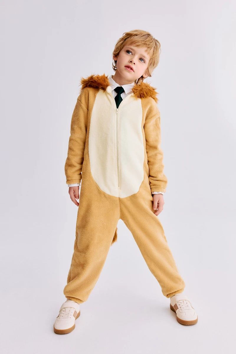 Déguisement en tissu peluche doux. Modèle avec capuche en matière duveteuse, doublée et agrémentée d'oreilles appliquées, fermeture éclair surmontée d'un protège-menton anti-irritations devant. Queue amovible. Élastique habillé aux poignets et en bas de jambe.