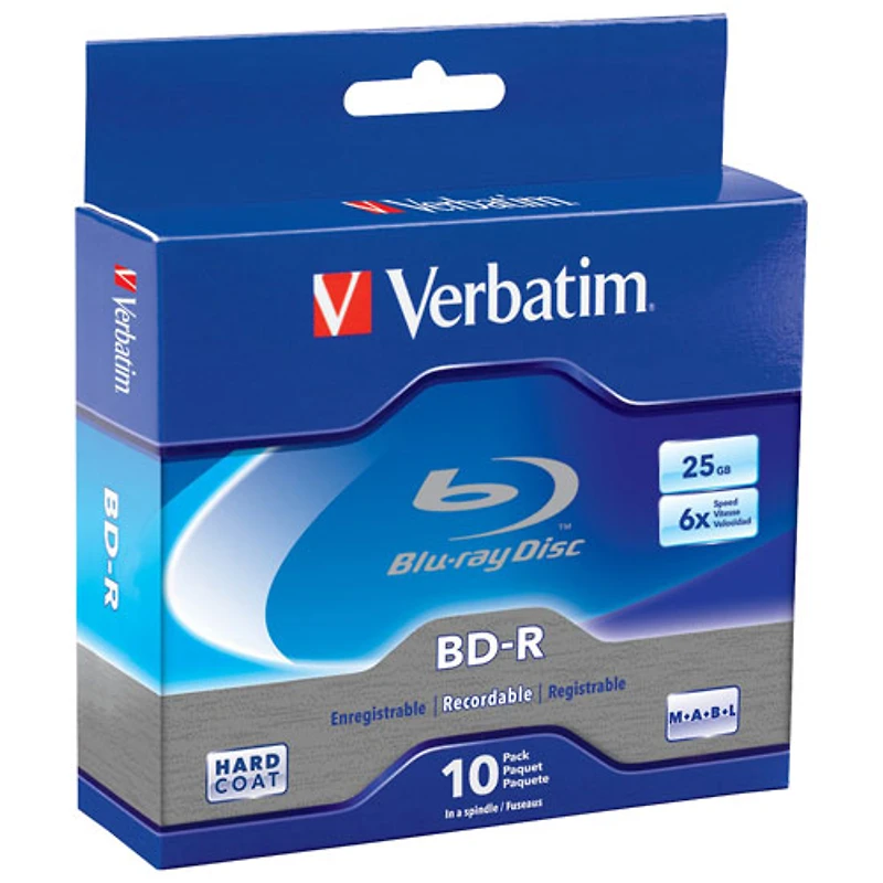 Carrousel de 10 disques BD-R 6x de 25 Go avec logo sur la surface Disques Blu-ray HD spécialement conçus pour contenir beaucoup de fichiers vidéo et audio HD Haute capacité signifiant que vous utiliserez moins de disques pour sauvegarder ou copier des enregistrements numériques en haute définition, comme votre bibliothèque musicale Certains disques récents prennent en charge la vitesse 6x de Verbatim comme étant 8x, 10x ou même 12x Disques BD-R 6x de Verbatim pouvant aussi être utilisés avec des graveurs 4x Disques traités avec une couche très dure pour prévenir les rayures, résister aux traces de doigts et réduire l'accumulation de poussière Compatible avec les lecteurs Blu-ray les plus récents de marques comme Sony, Pioneer, Panasonic et LG