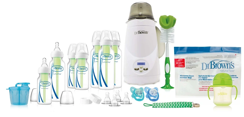 Tout ce dont vous avez besoin pour Happy Feeding ! L'ensemble-cadeau tout-en-un étroit de Dr. Brown's Options + offre à maman et à son bébé la possibilité d'être nourris, apaisés ou nettoyés au biberon. L'alimentation ne pose pas de problèmes avec une grande variété de formats de biberons Dr. Brown's Options + Narrow - tous prouvés cliniquement pour prévenir les coliques. Que vous ayez besoin de réchauffer les biberons avec le chauffe-biberon Dr. Brown's, d'ajuster le débit des tétines ou de passer votre biberon d'un biberon à un autre - le coffret cadeau tout-en-un a été pensé pour vous! Quand il s'agit de nettoyer, c'est un jeu d'enfant. Entre la brosse à bouteille, les brosses de nettoyage et les sachets pour stérilisateur à la vapeur pour micro-ondes, ces bouteilles seront nettoyées à l'intérieur et à l'extérieur en un rien de temps. Après avoir nourri et nettoyé, apaisez votre bébé en toute sécurité en utilisant les sucettes PreVent développées par un dentiste pédiatrique - et prenez une pause bien méritée! Sans BPA. 0m +, 3m +, 6m +.