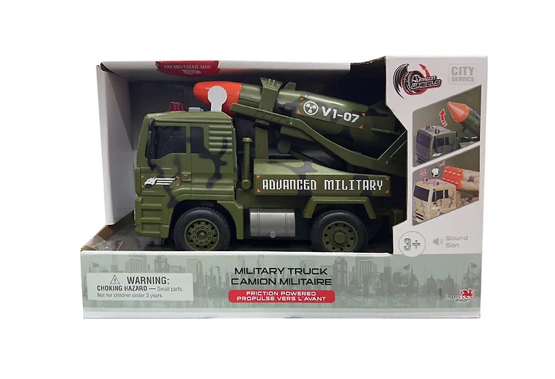 Ce camion militaire à l'échelle 1:20 est équipé d'un moteur à friction, d'une lumière et d'un son. Le lanceur peut être déplacé manuellement vers le haut et vers le bas.