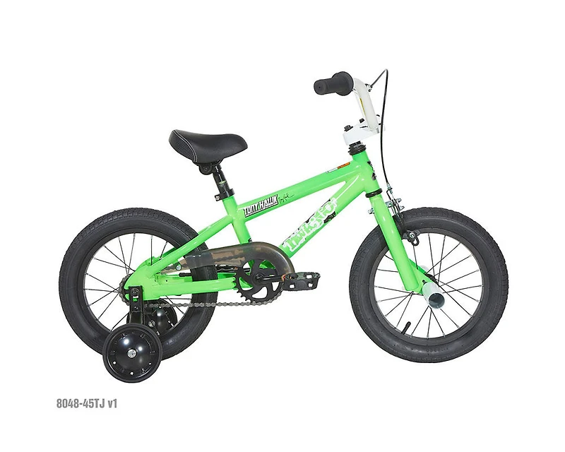 Graphiques Tony Hawk personnalisés Cadre en acier robuste Frein à main avant Roues stabilisatrices amovibles et réglables Cadre et fourche garantis à vie Les petits fans de Tony Hawk adoreront cette bicyclette Tony Hawk 360 de 14 po (35,56 cm)! Le cadre BMX vert fluo est orné de graphiques Tony Hawk personnalisés. Cette bicyclette de 14 po (35,56 cm) est munie d'un guidon rotatif blanc freestyle et de repose-pieds à l'avant. Elle est équipée d'un frein à étrier avant, d'un frein arrière à rétropédalage et de roues stabilisatrices réglables et amovibles. Les cyclistes en herbe apprendront à pédaler en toute confiance ou à parfaire leurs compétences sur cette bicyclette Tony Hawk 360 de 14 po (35,56 cm). Informez-vous auprès d’un associé en magasin pour demander un assemblage.