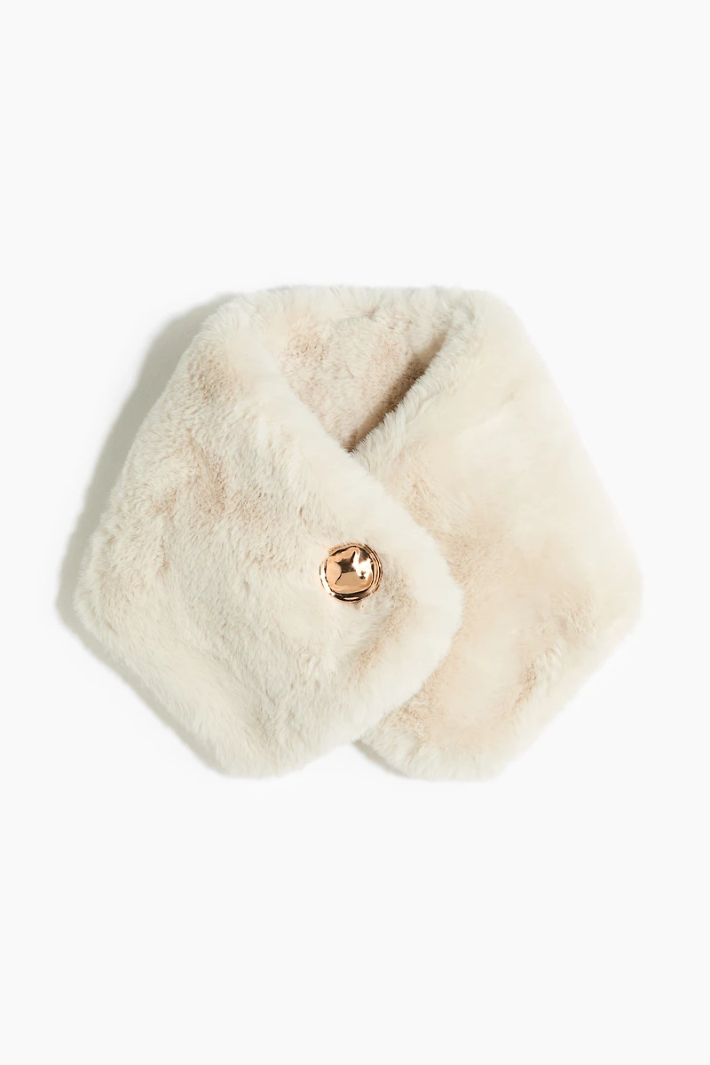 Écharpe en matière douce et duveteuse avec bouton en métal martelé devant.