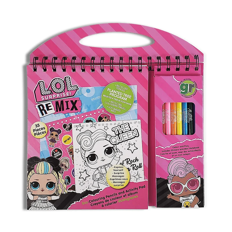 Une activité de coloriage de voyage qui comprend des autocollants, un mini-cahier, des pages à colorier et des crayons à colorier. Les matériaux utilisaient des journaux recyclés, du papier recyclé et des encres à base de soja.