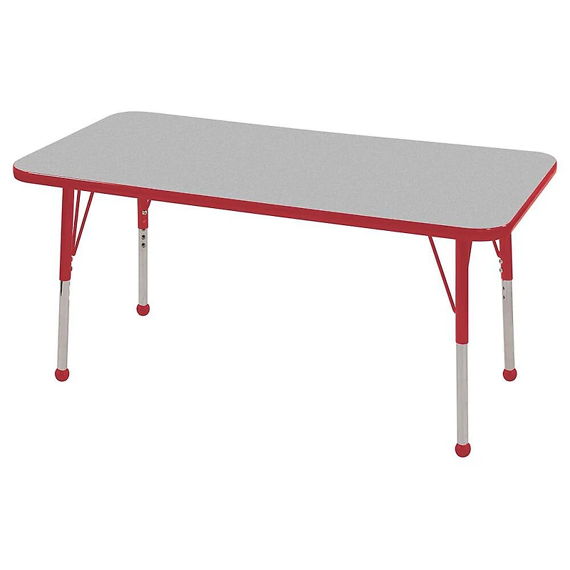 Plateau gris attrayant avec une bande rouge sur le pourtour et des pieds rouges Les pieds standards règlent la hauteur de la table de 48,2 cm à 76,2 cm par crans de 2,5 cm Embouts ronds en composite pour protéger les moquettes Les plateaux de table sont en laminé résistant aux taches et facile d'entretien des deux côtés Dimensions du plateau de la table : 61 cm L x 121,9 cm l Les Tables d'activités ajustables d'ECR4Kids sont parfaites pour la salle de classe, la maison ou le bureau ! Le plateau de la table est en stratifié double face facile à nettoyer, avec des coins arrondis pour plus de sécurité. Trois types de pieds de table ajustables sont disponibles : tout petit (38,1 cm-58,4 cm), compact (38,1 cm-61 cm), ou standard (48,2 cm-76,2 cm). La partie supérieure des pieds est en acier tubulaire thermolaqué, et la partie inférieure des pieds est chromée et se règle par crans de 2,5 cm. Les tables sont disponibles dans une variété de couleurs attrayantes, avec un choix d'embouts ronds ou pivotants.