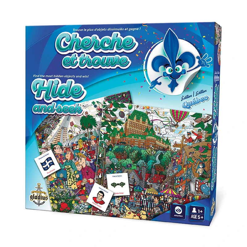 Voyagez dans la province de Québec (Canada) et découvrez des attraits touristiques majeurs de cette extraordinaire province. Ce jeu développe le sens de l'observation, la concentration et la rapidité chez les enfants de tout âge, tout en favorisant l'apprentissage d'une autre langue. Il s'agit de retrouver les illustrations dissimulées sur les planches de jeu et d'amasser le plus de cartes possible. Pour plus de défi, recherchez les édifices mystères et les personnages historiques. Une visite touristique excitante, remplie de découvertes et de défis à relever vous attend!