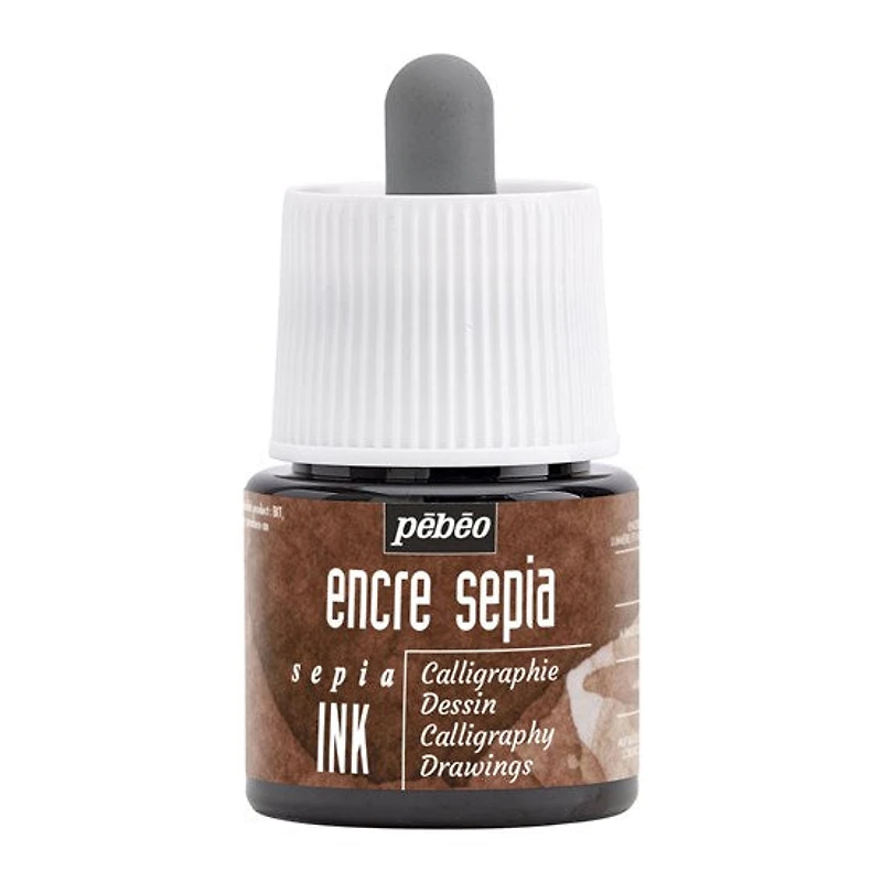 L’encre sépia de Pébéo est une encre fluide acrylique à base de pigments, dans une bouteille 45 ml avec une pipette. Tout comme l’encre de Chine, elle est idéale pour le dessin, les lavis et la calligraphie. Elle se dilue à l’eau pour les lavis. Une fois sèche, elle est stable à la lumière et indélébile.