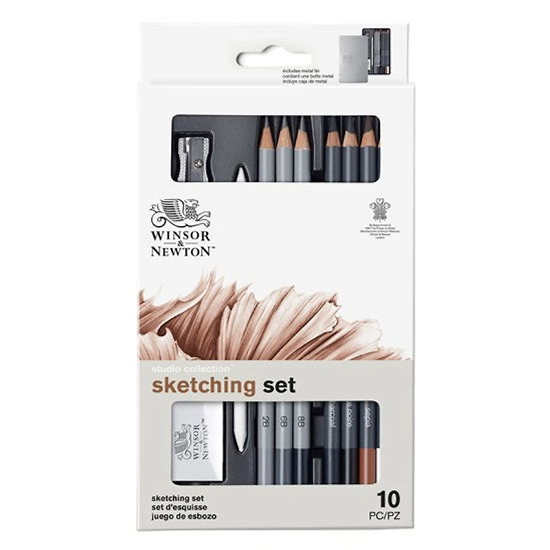 Crayons graphite et fusain de haute qualité, parfaits pour réaliser des croquis spontanés et capturer le mouvement !Les crayons graphite et fusain de la gamme Studio signée Winsor & Newton se mélangent facilement pour créer des ombres saisissantes, ce qui les rend idéaux pour créer des dessins et des natures mortes sur le vif, à la maison ou dans votre studio.La mine de ces crayons contient des liants de haute qualité, de sorte qu'ils ne se cassent pas facilement sous pression, même s'ils sont échappés. Ils sont disponibles dans une gamme de niveaux de dureté, parfaits pour capturer des tons sombres ou délicats, ou pour estomper les ombres et les détails fins.Ils sont fabriqués à partir de bois de cèdre durable et facile à aiguiser.Comprend : fusain blancfusain moyenfusain dursépia plus 2Bplus 4Bcrayons graphite 6B et 8Bcrayon graphite 8Bmélangeurgomme et taille-crayon