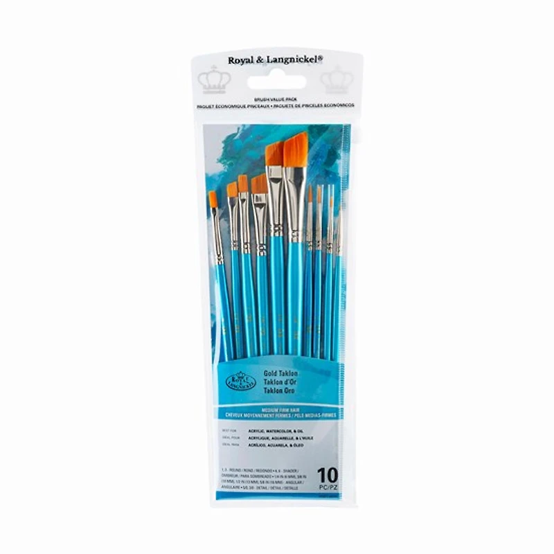 Un ensemble de 10 pinceaux assortis en taklon or. Leurs poils en taklon or moyennement fermes conviennent à l'acrylique, à l'aquarelle et à l'huile.Comprend :5/0, 3/0 (détails)4, 6 (ombreur)1/4, 3/8, 1/2, 5/8 (angulaire) 1, 3 (rond)Comment entretenir vos pinceauxCette étape primordiale maximise l’efficacité des pinceaux et prolonge leur durée de vie. Ne jamais laisser sécher les pinceaux avant de les nettoyer.Huile : Tremper le pinceau dans un solvant (p. ex. Taltine). Nettoyer à l’eau savonneuse et rincer à l’eau tiède.Acrylique : Nettoyer à l’eau savonneuse et rincer à l’eau tiède.Aquarelle : Tremper le pinceau dans l’eau, puis le rincer à l’eau tiède.