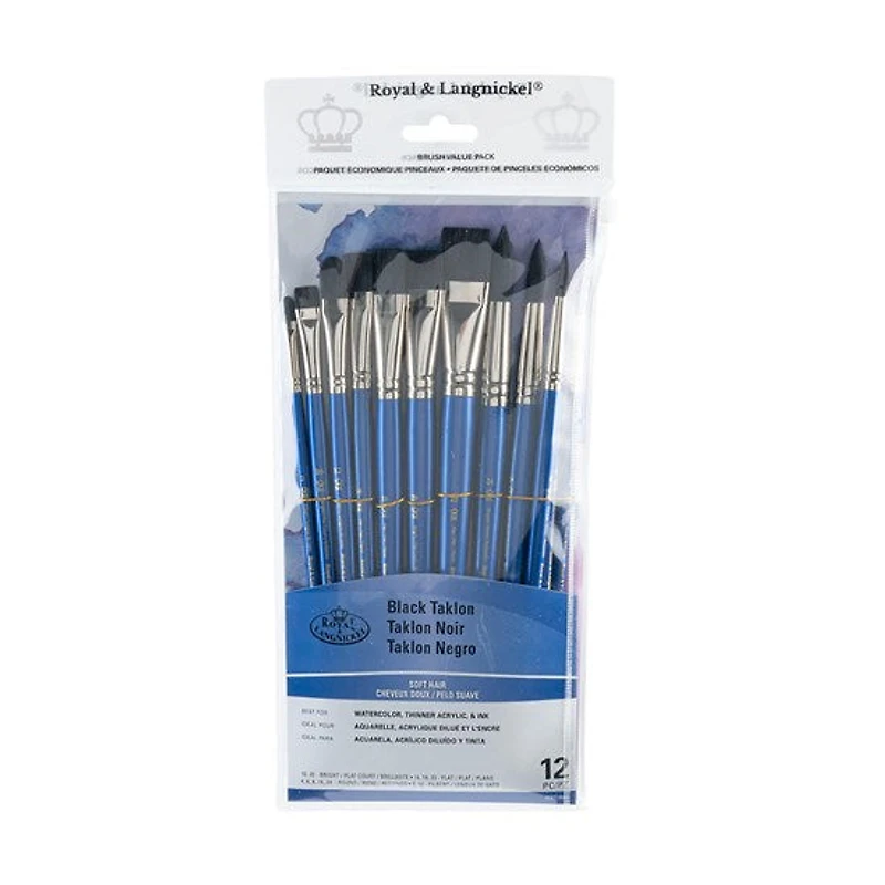 Un ensemble de 12 pinceaux assortis en taklon noir. Leurs poils en taklon noir doux conviennent à l'acrylique diluée, à l'aquarelle et à l'encre.Comprend :10, 20 (plat court)14, 18, 22 (plat)4, 6, 8, 16, 24 (rond)2, 12 (filbert)Comment entretenir vos pinceauxCette étape primordiale maximise l’efficacité des pinceaux et prolonge leur durée de vie. Ne jamais laisser sécher les pinceaux avant de les nettoyer.Huile : Tremper le pinceau dans un solvant (p. ex. Taltine). Nettoyer à l’eau savonneuse et rincer à l’eau tiède.Acrylique : Nettoyer à l’eau savonneuse et rincer à l’eau tiède.Aquarelle : Tremper le pinceau dans l’eau, puis le rincer à l’eau tiède.