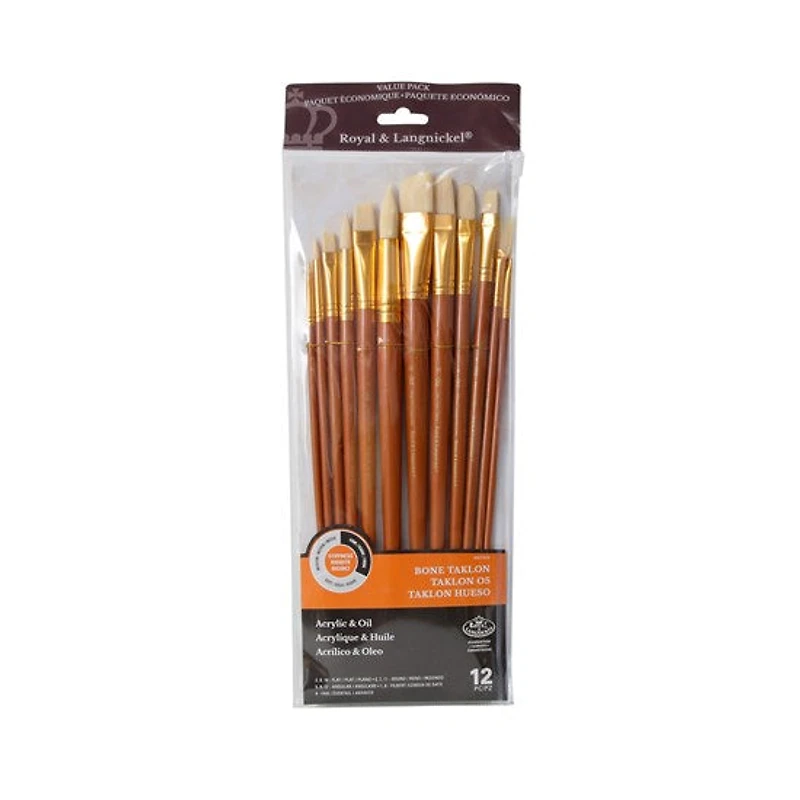 Ens. 12 pinceaux en taklon os à manche long plats