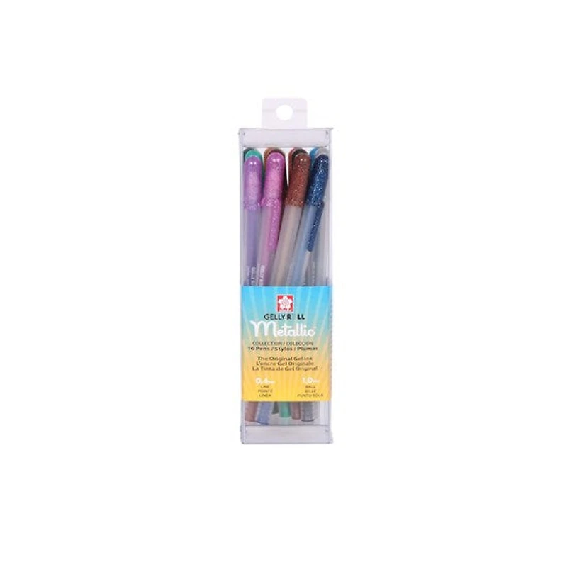 Ensemble de 16 stylos à encre gel de couleurs métalliques. Les stylos à l’encre gel Gelly Roll® sont parfaits pour écrire des lettres, décorer les pages de collimage et mettre en valeur les étampes et les œuvres. Leur encre de couleur vibrante ne bave pas, ne s’étale pas et ne traverse pas la plupart des papiers.