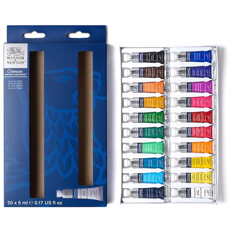 Formulées pour offrir transparence et résistance à la lumière, les aquarelles Cotman sont abordables sans compromis sur la qualité. Elles sont formulées à partir de pigments beaux-arts à charge pigmentaire réduite. Leur qualité transparente assure une consistance uniforme, ce qui est parfait pour les aquarellistes débutants et plus avancés. Classées AA et A pour leur excellente et bonne résistance à la lumière, les aquarelles Cotman offrent aux artistes la qualité attendue d'une gamme d'aquarelles de qualité.Cet ensemble contient 20 x 5 ml : blanc de Titane, citron pâle, jaune d’impression, jaune cadmium foncé, orange cadmium, rouge cadmium, rose permanent, magenta d’impression, violet pâle, bleu Winsor, outremer, cyan d’impression, turquoise foncé, vert moyen permanent, vert olive, teinte chair, terre de Sienne brûlée opaque, ocre jaune, jaune de Naples, noir de Mars