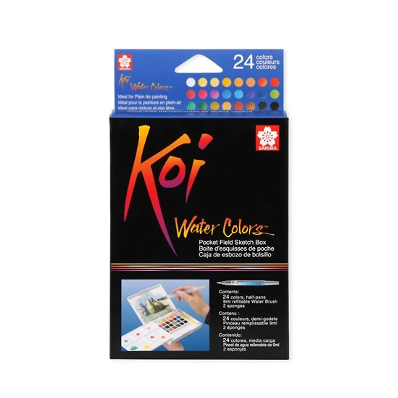 L'ensemble Sakura qui permet de peindre un peu, beaucoup, tout partout. Tout y est : boitier compact et résistant, 24 mini godets d'aquarelle de qualité, un design qui cache plein de surprises et surtout, un pinceau-réservoir, pour vous permettre d'avoir de l'eau partout. Un cadeau de liberté créative pour vous ou votre artiste préféré.Comprend :un coffret de 24 aquarelles (demi-godets)Pinceau à réservoir de 9 ml1 épongeun couvercle transformable en chevaletpalette amovible