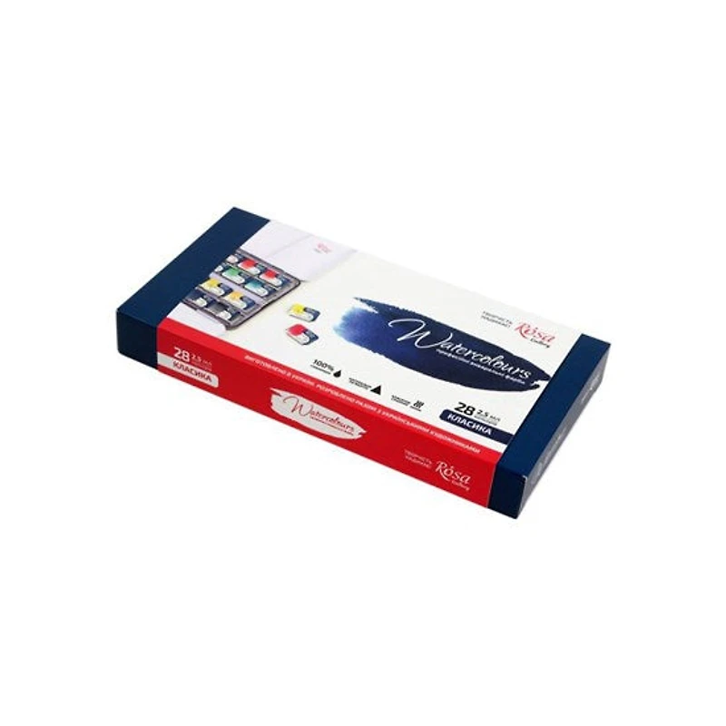 Les aquarelles qualité beaux-arts signées ROSA Gallery sont fabriquées à partir de gomme arabique organique et de pigments organiques et inorganiques de qualité supérieure finement broyés : elles sont produites en collaboration avec des artistes professionnels. Elles se caractérisent par une grande résistance à la lumière, une forte concentration de pigments, des couleurs claires et éclatantes. Ces peintures sont également faciles à diluer et à appliquer au pinceau. Des matériaux de haute qualité, une approche professionnelle et des équipements spécialisés de pointe garantissent une aquarelle grande qualité !Cet ensemble comprend 28 couleurs : 702 citron cadmium731 jaune cadmium clair732 jaune cadmium foncé730 jaune or705 orange cadmium706 rouge cadmium clair707 rouge cadmium moyen708 carmin725 rouge de garance710 violet713 vert olive711 vert712 vert émeraude714 turquoise716 bleu de cobalt718 bleu715 outremer738 bleu indanthrène717 indigo719 jaune ochre721 terre de Sienne brute736 rouge anglais733 terre de Sienne brûlée722 ombre720 sépia723 brun de Mars737 gris de Payne724 noir neutre