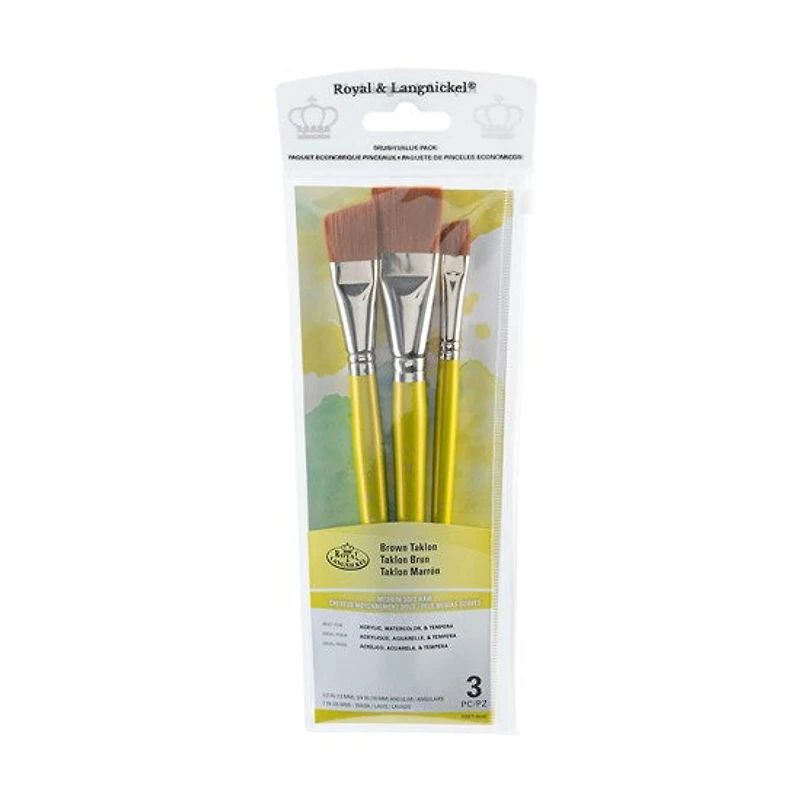 Un ensemble de 3 pinceaux assortis en taklon brun. Leurs poils en taklon brun moyennement doux conviennent à l'acrylique, à l'aquarelle et à la détrempe.Comprend : 1/2 po, 3/4 po (angulaire)1 po (lavis)Comment entretenir vos pinceauxCette étape primordiale maximise l’efficacité des pinceaux et prolonge leur durée de vie. Ne jamais laisser sécher les pinceaux avant de les nettoyer.Huile : Tremper le pinceau dans un solvant (p. ex. Taltine). Nettoyer à l’eau savonneuse et rincer à l’eau tiède.Acrylique : Nettoyer à l’eau savonneuse et rincer à l’eau tiède.Aquarelle : Tremper le pinceau dans l’eau, puis le rincer à l’eau tiède.