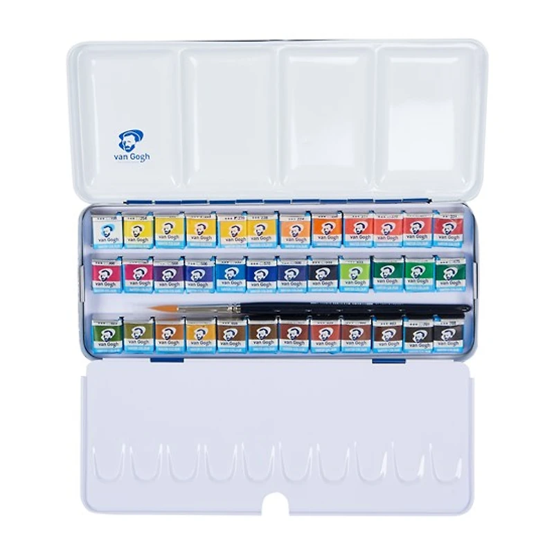 L'aquarelle Van Gogh est une gamme de peintures de qualité étudiant et artiste. Les couleurs sont brillantes, transparentes et intenses, au pouvoir colorant élevé. La plupart des couleurs sont classées avec le plus haut degré de résistance à la lumière +++ (plus de 100 ans dans des conditions de musée), avec quelques couleurs notées juste un degré en dessous de ++ (25-100 ans dans des conditions de musée). Cette aquarelle se travaille et se mélange aisément grâce à sa pureté et à sa viscosité uniforme.Cet ensemble de 36 demi-godets est emballé dans une boîte en métal et contient :• 1 pinceau rond à soies synthétiques (taille 3)• 36 demi-godets dans les couleurs suivantes : Blanc chinois 108, Jaune citron permanent 254, Jaune azo clair 268, Jaune azo moyen 269, Jaune azo foncé 270, Jaune de Cambodge 238, Jaune de Naples rouge 224, Orange permanent 266, Rouge vermillon 311, Rouge permanent clair 370, Rouge permanent foncé 371, Garance foncé 331, Rose quinacridone 366, Rouge permanent violet 567, Bleu permanent violet 568, Bleu outremer foncé 506, Bleu céruléen phthalo 535, Bleu phthalo 570, Bleu de Prusse 508, Indigo 533, Vert jaunâtre permanent 633, Vert viride 616, Vert permanent 662, Vert phthalo 675, Vert printemps 623, Vert olive 620, Jaune ocre 227, Terre de Sienne brute 234, Terre d'ombre brute 408, Sépia 416, Terre de Sienne brûlée 411, Rouge oxyde clair 339, Terre d'ombre brûlée 409, Brun Van Dijck 403, Noir ivoire 701, Gris de Payne 708.