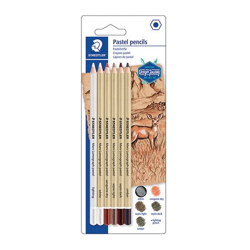 Des crayons-pastel de haute qualité avec une mine spécialement formulée et un haut niveau de pigment pour des détails fins au pastel. Ils sont particulièrement adaptés aux mélanges et aux hachures, ainsi qu'aux croquis et portraits expressifs. Bois provenant de forêts certifiées FSC® et gérées durablement.Spécifications :Diamètre de la mine : environ 3,6 mmRecommandation pour l'aiguisage : aiguisoir à deux trous Mars 510 25 ou papier de verre 923 pour un aiguisage optimal.Couleurs : sépia clair, sépia foncé, umbre, sanguine sèche, blanc, éclairage