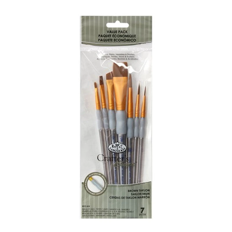 Les pinceaux Crafter’s Choice de Royal & Langnickel offrent une variété d’options pour réaliser tous vos projets de peinture et d’artisanat. Les manches en polymère résistant comportent un revêtement en caoutchouc pour plus de confort. Cet ensemble compte 7 pinceaux plats de qualité en poils de taklon noir. Conviennent à l’huile, l’acrylique, l’aquarelle et la tempera.Comprend :- biseauté R9168-3/8- ronds R9258-3, 5 et 8- ombreur R9158-8- à lavis R9708-3/4- usé bombé R9178-2Entretien : Cette étape primordiale maximise l’efficacité des pinceaux et prolonge leur durée de vie. Ne jamais laisser sécher les pinceaux avant de les nettoyer.Huile : Tremper le pinceau dans un solvant (p. ex. Taltine). Nettoyer à l’eau savonneuse et rincer à l’eau tiède.Acrylique : Nettoyer à l’eau savonneuse et rincer à l’eau tiède.Aquarelle : Tremper le pinceau dans l’eau, puis le rincer à l’eau tiède.
