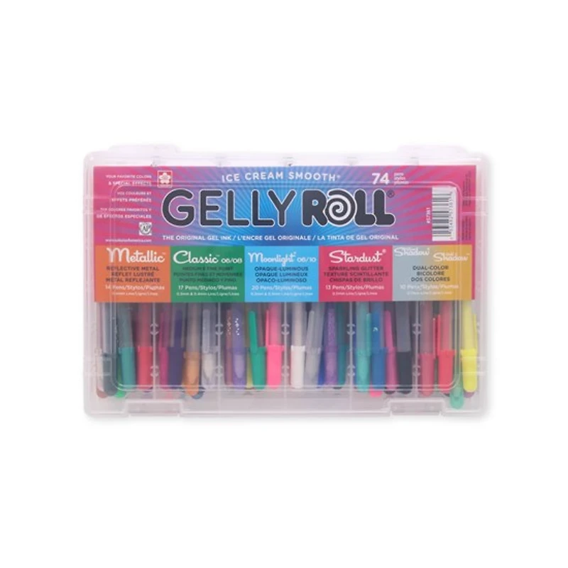 Ensemble-cadeau Gelly Roll®. Cet ensemble de 74 stylos à encre gel comprend des modèles métalliques, classiques, Moonlights®, Stardust® et Shadow®, le tout présenté dans une boîte de rangement pratique en plastique.Les stylos à l’encre gel Gelly Roll® sont parfaits pour écrire des lettres, décorer les pages de collimage et mettre en valeur les étampes et les œuvres. Leur encre de couleur vibrante ne bave pas, ne s’étale pas et ne traverse pas la plupart des papiers.