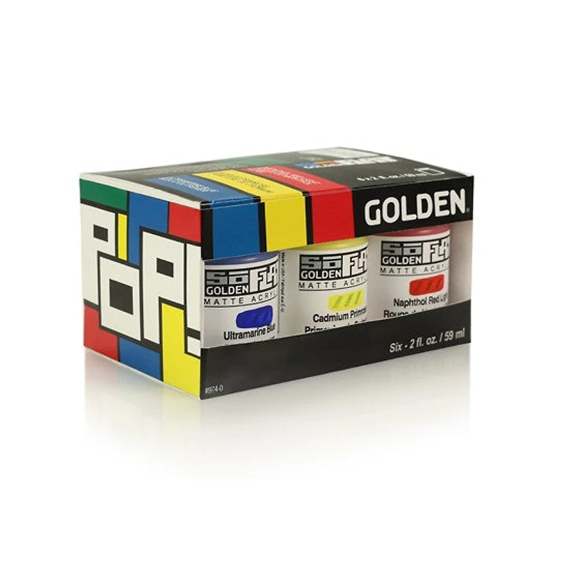 La peinture acrylique SoFlat de Golden se décline dans une sélection inégalée de nuances mates intenses, permettant d'obtenir des surfaces uniformes riches en couleurs, et ce, en moins de couches. Elle sèche en un fini lisse non réfléchissant, avec un meilleur pouvoir couvrant et plus de stabilité que d'autres acryliques. L'ensemble Pop contient 6 pots de 2 oz : primevère de cadmium, rouge de naphtol, bleu outremer, vert permanent, noir et blanc de titane.
