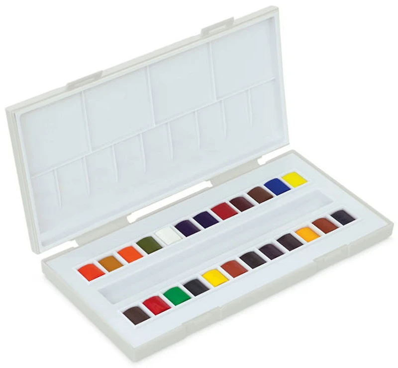 Ce boîtier compact et léger est idéal pour la peinture en plein air. La boîte de plastique durable contient 24 demi-godets d’aquarelle Sennelier de couleurs variées, une palette et une sangle élastique pour faciliter la tenue en main. Fabriqué en France.
