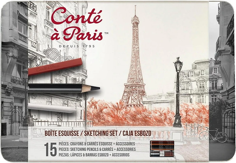 Découvrez le coffret Esquisse 15 pièces de Conté à Paris, un kit complet pour tous vos dessins et croquis. Cette boîte métallique contient 7 crayons et 6 carrés de craie, accompagnés d’accessoires essentiels pour l’esquisse.
