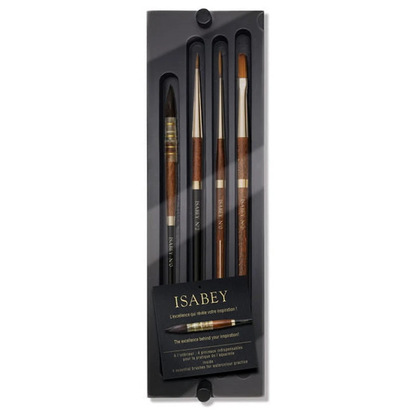Isabey, l’excellence qui révèle votre inspiration ! À l’intérieur de ce coffret, vous trouverez quatre pinceaux de qualité supérieure, indispensables pour l’aquarelle : le Martre kolinsky pure no.2, le Petit gris pur no.0, le Syrus no.0 et l’Isaqua no.2. Le pinceau Martre kolinsky pure no.2 offre ressort et résistance ; il est idéal pour les travaux de précision et les détails. Le pinceau Petit gris no.0 pur a une capacité inégalée de rétention de la couleur et de réserve d’eau ; il est parfait pour les touches très longues et les lavis. Le pinceau Syrus no.0 réunit la rétention de la martre et la souplesse du synthétique, ce qui permet de répondre à divers projets. Le pinceau Isaqua no.2 est un pinceau en fibre synthétique qui possède des propriétés proches de la martre. Dotée d’une nervosité et d’un ressort, cette fibre vous permettra de réaliser les travaux les plus précis.Entretien : Garant de leur durabilité et de leur condition, le nettoyage des pinceaux est essentiel. Toujours nettoyer les pinceaux avant que la peinture ne sèche. L’utilisation d’un nettoyant hydratant pour pinceaux après un traitement à la Taltine ou au savon évite aux soies de sécher et contribue au maintien de leur souplesse.Aquarelle : nettoyer à l’eau chaudeHuile : tremper le pinceau dans un solvant type Taltine ; nettoyer avec de l’eau chaude savonneuse et rincer à l’eau claireAcrylique : nettoyer à l’eau chaude savonneuse et rincer à l’eau claire