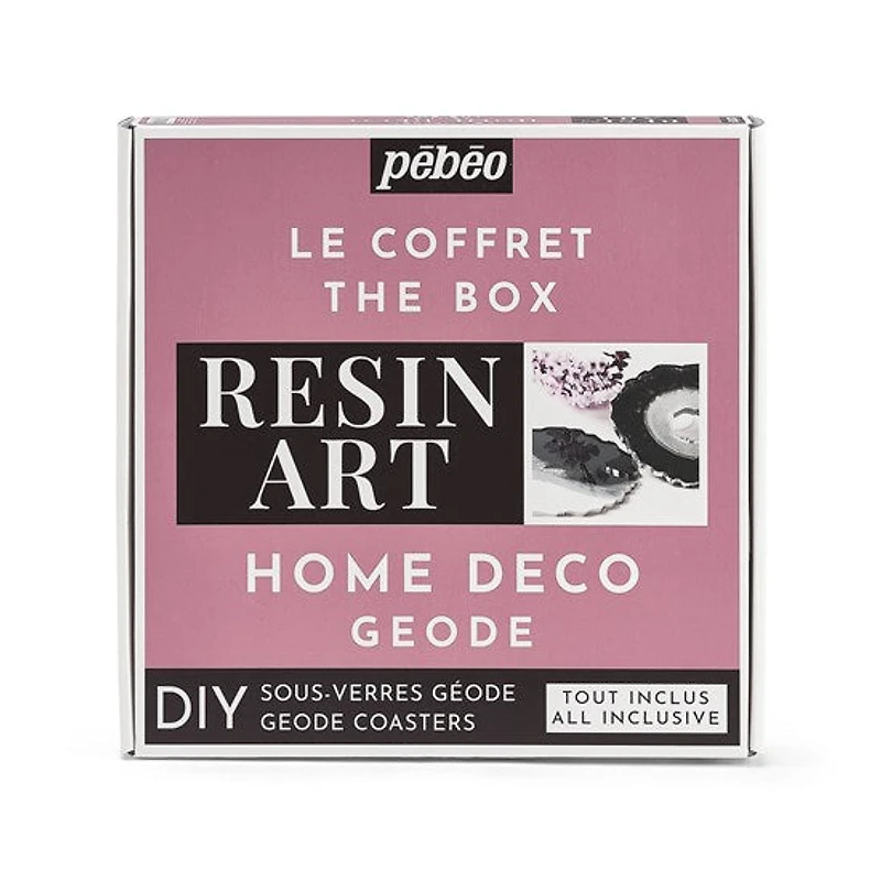 Un coffret entièrement conçu et dédié à la pratique de l’activité tendance du moment : la résine. Son contenu permet de réaliser soi-même des sous-verres de style géode, de façon simple grâce à un pas-à-pas explicatif et des inspirations. Lancez-vous !Contient :150 ml de Résine Cristal Biosourcée2 x moules en silicones (forme de géode, 13 cm)3 x tubes 20 ml de Pigment Fluide (blanc, noir, argent)1 x 4Artist Marker (argent, pointe 2 mm)inspirations à visionner via un code QR