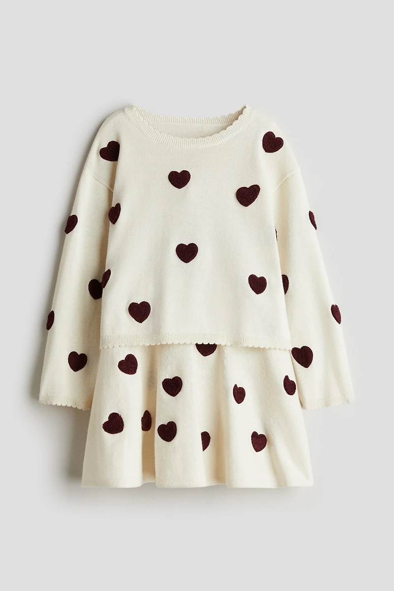 Ensemble en tricot de coton doux, composé d'un chandail et d'une jupe. Pull à encolure ronde et manches longues. Jupe évasée avec élastique habillé à la taille.
