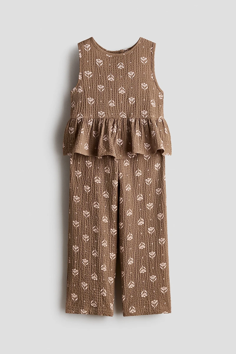 Ensemble en jersey froissé, composé d'un haut sans manches et d'un pantalon assorti. Haut à encolure ronde avec pan croisé dans le dos, muni d'un bouton apparent et d'un bouton dissimulé. Large volant froncé au bas, se prolongeant dans le dos. Pantalon avec élastique à la taille et jambes droites.