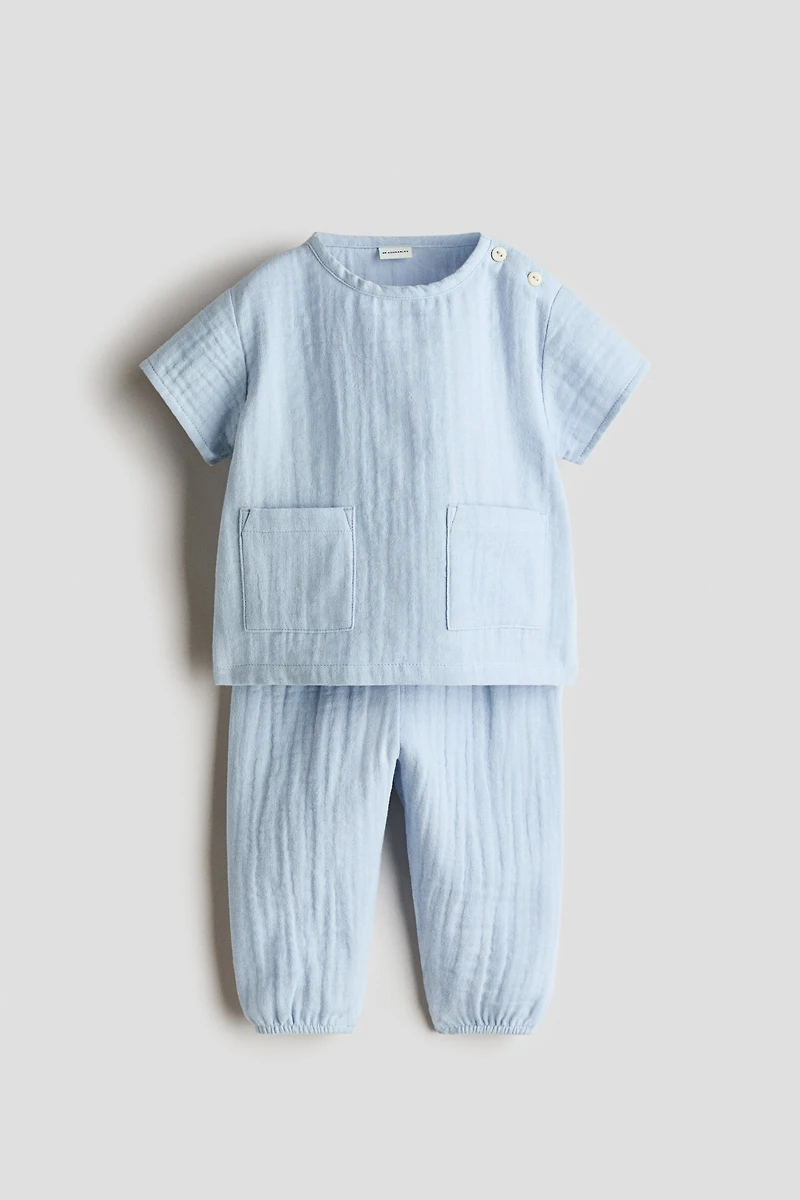 Ensemble en douce mousseline de coton de haute qualité, composé d'un haut et d'un pantalon. Haut à encolure ronde avec boutons sur une épaule et manches courtes. Poches plaquées devant. Pantalon avec élastique et cordon de serrage à la taille. Petit élastique habillé en bas de jambe. La collection H&M Adorables regroupe une sélection d'articles de qualité très confortables au charme intemporel.