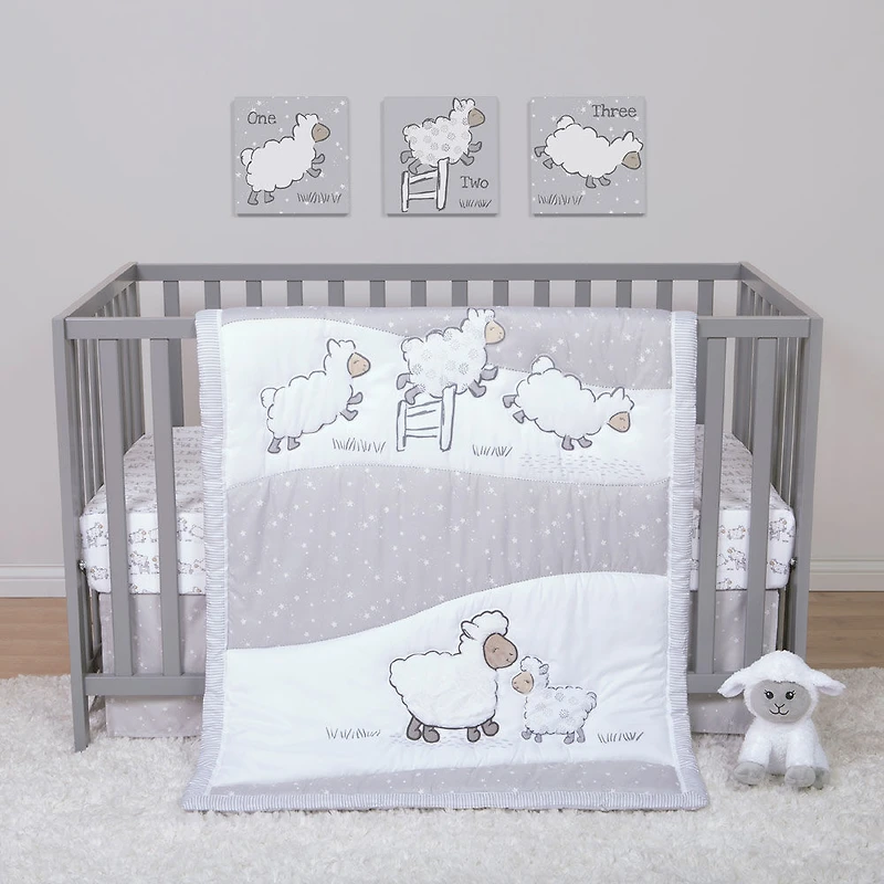 Endormez votre petit en comptant avec l'ensemble 4 pièces de literie pour berceau Mouton somnolent de Sammy and Lou Un éventail de moutons rêveurs sautant une clôture entourée d'un imprimé d'étoile scintillante sur un arrière-plan à bande, couleurs classiques de blanc, gris et de taupe.