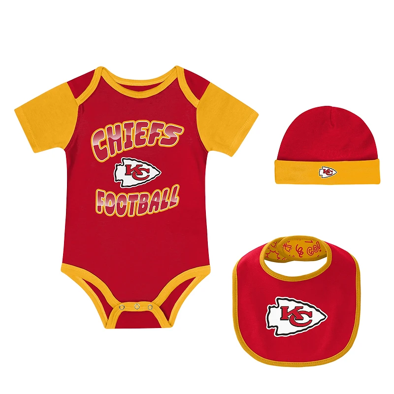 Initiez votre tout-petit à la passion des Kansas City Chiefs dès son plus jeune âge avec cet ensemble body, bavoir et bonnet à revers Tag Team d'Outerstuff. Sa matière douce 100 % coton est douce pour la peau délicate, tandis que son encolure à bretelles et sa fermeture à trois boutons-pression facilitent le change. Orné du nom et du logo de l'équipe des Kansas City Chiefs sur chaque pièce, cet ensemble garantit à votre nouveau supporter d'être prêt pour le jour J.