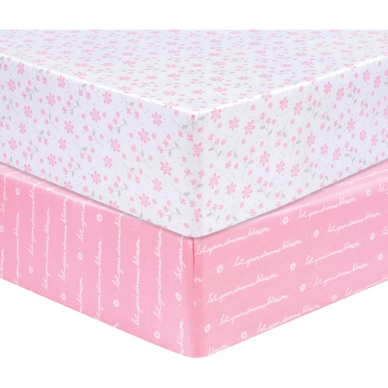 L'ensemble de 2 draps-housses en microfibre pour lit de bébé Sammy & Lou porte un imprimé floral en rose pâle et gris pâle sur fond blanc et une pensée écrite " let your dreams blossom " en blanc sur fond rose pâle.