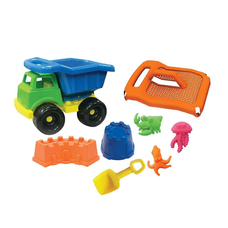 Cet ensemble de camion à benne basculante est plein de plaisir à la plage ! Le camion à benne basculante est doté d'une benne inclinable robuste qui contient 2 moules à sable, une pelle et 3 formes de sable. Le couvercle du lit de décharge facile à encliqueter et à enlever sert de grand tamis à sable, le couvercle a également une poignée de transport moulée robuste pour déplacer facilement l'ensemble de la plage au bac à sable.