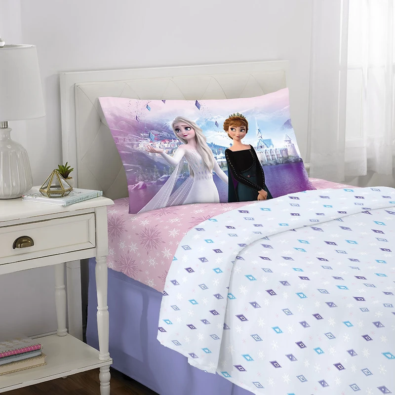 L'automne et l'hiver se rencontrent sur cet ensemble de draps doux, vous rappelant de faire confiance à la vie. Le drap plat et le drap-housse sont pourvus de différentes silhouettes sur un dégradé de violet à bleu. Le devant des taies d'oreiller comprend Anna et Elsa, et le dos met en vedette un imprimé graphique de la silhouette d'Elsa avec des paroles inspirantes. Ensemble de draps 3 morceaux pour lit une place : Le drap-housse et le drap plat conviennent à un lit une place standard et la taie d'oreiller convient à un oreiller de taille standard. Le drap-housse mesure 39 po x 75 po, le drap plat mesure 66 po x 96 po et la taie d'oreiller mesure 20 po x 30 po. Les draps et la taie d'oreiller sont entièrement faits de microfibre de polyester et les parents occupés peuvent aisément les laver à la machine!