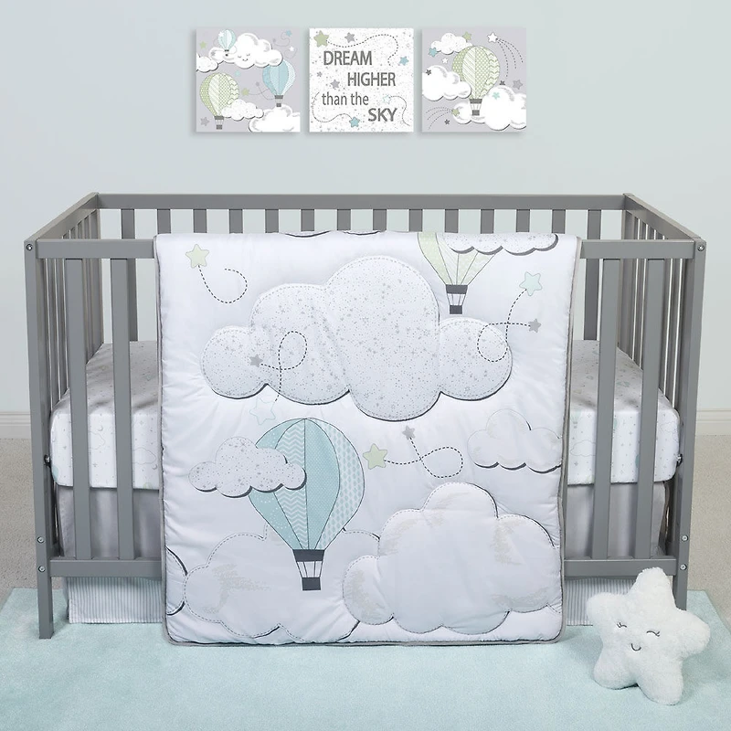 L'ensemble comprend un édredon de pouponnière, un drap-housse ajusté, une jupe de berceau et un jouet en peluche L'édredon mesure 35 x45 po (89 x 114 cm) et est merveilleux pour le jeux de bédaine et peut être utilisé pendant le jeu la jupe s'ajuste aux berceaux de matelas standards de 28 x 52 po (71 x 132 cm) avec une profondeur de 14 po (35.5 cm) Le drap-housse s'ajuste aux matelas standards de 28 x 52 po (71 x 132 cm) avec des poches de 8 po (20 cm) et est complètement élastique pour un ajustement serré. Le drap comprend un imprimé céleste sur un fond blanc et eau Un jouet étoile fait de peluche blanche douce. Il mesure 9 po (23 cm) de large Ensemble 4 pièces de literie de berceau rêves étoilés de sammy and Lou