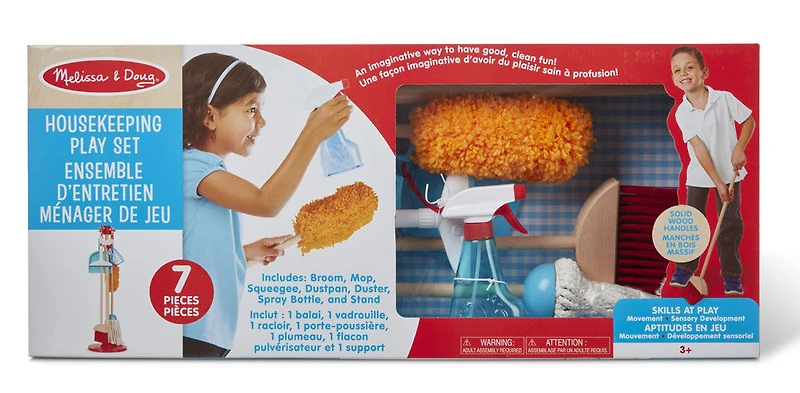 Cet ensemble de nettoyage de 7 pièces est le moyen idéal de transformer les tâches ménagères en jeux domestiques ! De taille adaptée aux enfants et conçus pour durer, le balai, la serpillière, le plumeau, la pelle à poussière, la raclette et le flacon pulvérisateur sont confortables à utiliser et faciles à ranger. Il suffit de les suspendre à l'aide des cordons robustes sur le support en bois inclus pour un rangement propre et compact. (Les poignées en bois naturel ajoutent de la durabilité et un aspect classique, tandis que les couleurs vives ajoutent de la gaieté à l'ensemble ! Les enfants de trois ans et plus adoreront garder les choses propres et ordonnées tout en s'amusant ! - Ensemble de nettoyage 7 pièces pour jouer à faire semblant de faire le ménage - Comprend un balai, une serpillière et un plumeau en bois massif, une pelle à poussière durable, une raclette et un flacon pulvérisateur. - Les pièces sont suspendues sur un support en bois solide. - Compétences en jeu : mouvement, développement sensoriel - 3 ans et plus