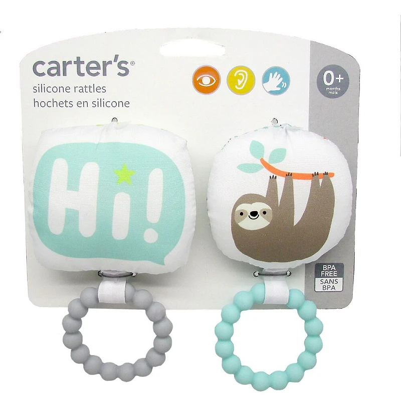 Comprend 2 hochets Anneau de dentition en silicone Sans BPA Bébé sera ravi d'entendre le hochet de ces jolis hochets en peluche de Carter's. Cet ensemble 2 pièces à hochet sera doux et câlin dans les mains de bébé et constitue un anneau en silicone parfait pour mastiquer bébé. Les couleurs vives et contrastées attireront l'attention de bébé tandis que les sons de hochet rappellent les petites oreilles. Diverses textures encouragent bébé à toucher et à explorer. Parfait pour votre bébé ou offrez-le en cadeau!