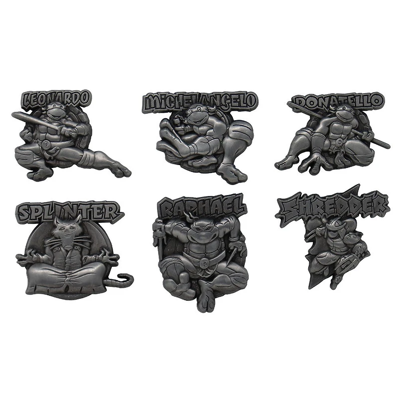 Limitée à l'année 1987 dans le monde entier (pour commémorer le lancement du dessin animé), cette série de 6 pins en métal représentant Leonardo, Donatello, Michelangelo, Raphael, Maître Splinter et Shredder est présentée dans un coffret de collection, devenant un excellent ajout à la collection de tout fan.