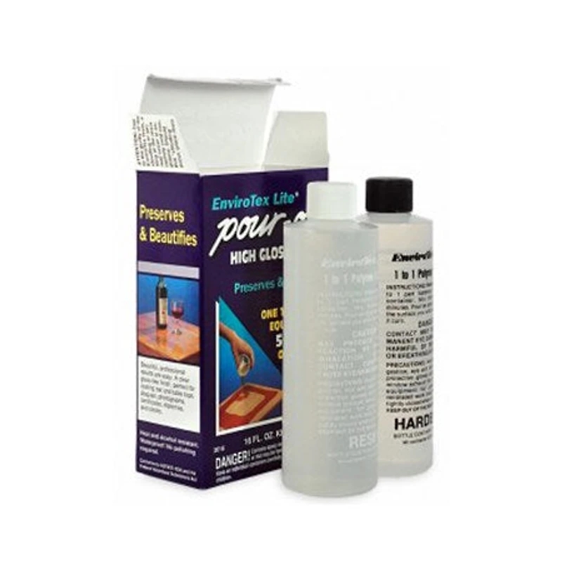 Envirotex Lite est un produit similaire à la résine à verser pour obtenir un fini très brillant! Envirotex Lite est un composé polymère réactif transparent à base d’eau. Il durcit en un revêtement brillant et épais en environ 8 heures à 70 °F, et atteint sa pleine force et résistance en 48 heures approximativement. Ce matériau durable ne nécessite pas de polissage pour produire une haute brillance. Une seule couche est généralement nécessaire pour obtenir une finition attrayante et une couche d’étanchéité. Plusieurs couches peuvent aussi être appliquées l’une sur l’autre en prenant soin d’essuyer la surface avec un chiffon propre et de l’alcool entre chaque couche.Pour des instructions plus détaillées sur la façon d’utiliser ce produit, veuillez cliquer sur le lien « plus d’informations » au haut de la page.Quantité : 16 ozCouverture : 4 pieds carrés