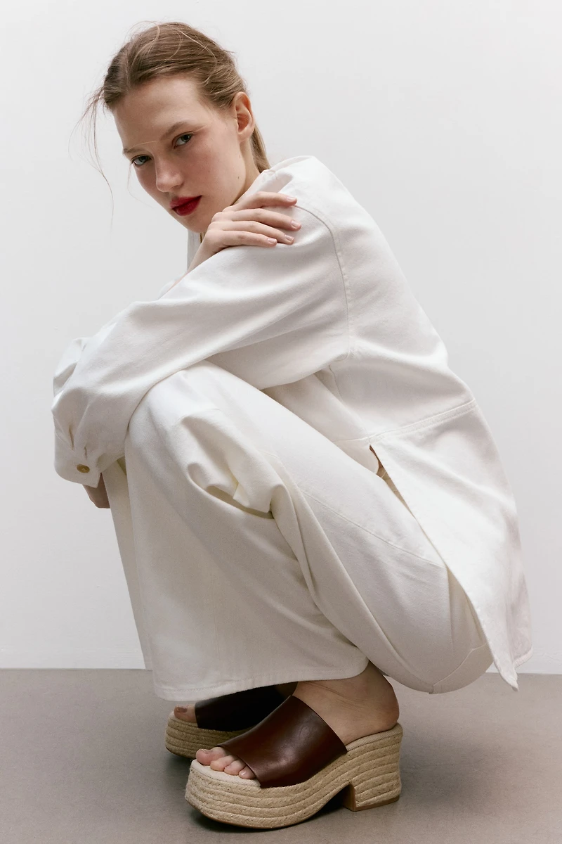 Espadrilles à plateforme avec talon bloc. Modèle à large bride sur le dessus. Semelle intérieure en toile et bande de jute tressé autour de la plateforme et du talon.