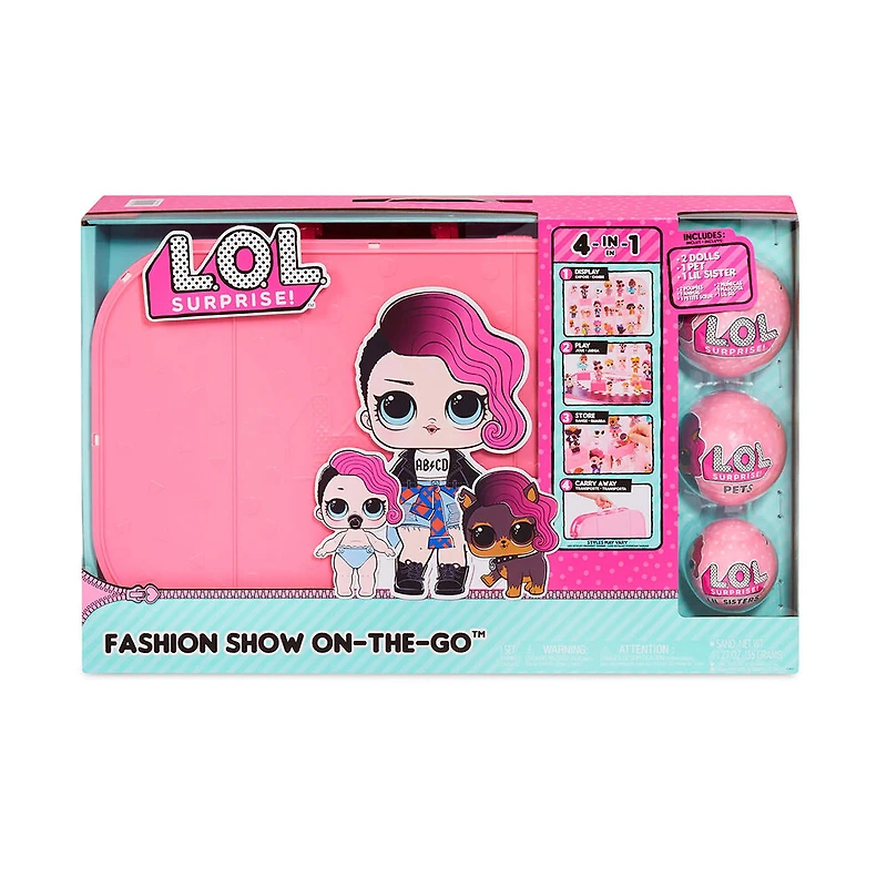ENSEMBLE DE JEU 4 en 1. LOL Surprise Fashion Show On-the-Go est un ensemble de jeu 4 en 1 : jeu de défilé de mode, exposez 18+ poupées et animaux, rangez les poupées et les accessoires et apportez le coffret LOL Surprise on-the-go en tout lieu.