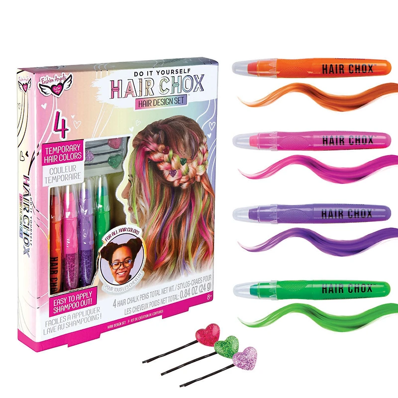 Hair Chox ajoute de la couleur temporaire où vous voulez! Accentez votre nouvelle couleur avec des paillettes - les options syling sont infinies! Vous obtenez 4 différents cheveux chox dans de grandes couleurs pour tous les types de cheveux et 3 gousses de paillettes pour l''accent amusant. Hair Chox se lave facilement avec votre prochain shampooing. Age recommandé de 8 ans et plus