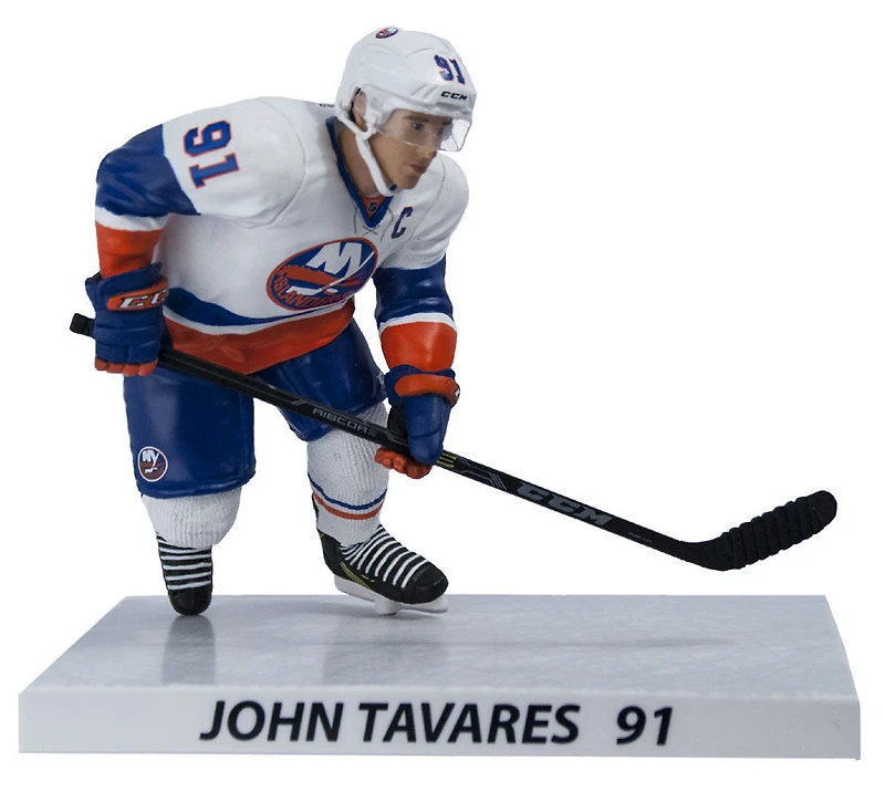 Figurine NHL John Tavares de 6 pouces en PVC de luxe. Comprend une figurine, une plaque et un bâton de hockey. La plaque a une surface de glace détaillée et le nom du joueur et le numéro sont en vedette à l'avant du stand.