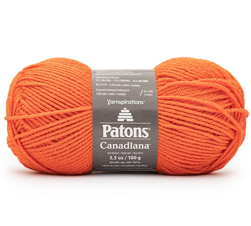 Acrylique Premium 100%, un plaisir de travailler en tricot ou crochet Qualité traditionnelle peignée Facile d'entretien: lavage et séchage impeccables Une grande variété de teintes inspirantes solide et vivante, teintes bigarrées Entretien: séchage à plat, lavage à la main Grosseur du fil: niveau 4, moyen   CARACTÉRISTIQUES Patons Styles Canadiana: Solides et Ombres Échantillon: 20 m - 26 rangs = 4" (10 cm) Aiguille à tricoter suggérée: 4,50 mm, US - 7 Crochet suggéré: 5,00 mm, US - H / 8  Solides Fibre: 100% Acrylique Poids: 3.50 oz / 100 g Longueur: 205 m / 187 m  Ombres Fibre: 100% Acrylique Poids: 3.50 oz / 100 g Longueur: 192 m / 176 m