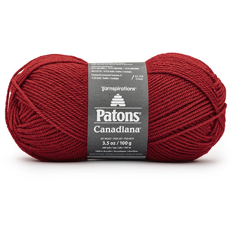 Acrylique Premium 100%, un plaisir de travailler en tricot ou crochet Qualité traditionnelle peignée Facile d'entretien: lavage et séchage impeccables Une grande variété de teintes inspirantes solide et vivante, teintes bigarrées Entretien: séchage à plat, lavage à la main Grosseur du fil: niveau 4, moyen CARACTÉRISTIQUES Patons Styles Canadiana: Solides et Ombres Échantillon: 20 m - 26 rangs = 4" (10 cm) Aiguille à tricoter suggérée: 4,50 mm, US - 7 Crochet suggéré: 5,00 mm, US - H / 8 Solides Fibre: 100% Acrylique Poids: 3.50 oz / 100 g Longueur: 205 m / 187 m Ombres Fibre: 100% Acrylique Poids: 3.50 oz / 100 g Longueur: 192 m / 176 m