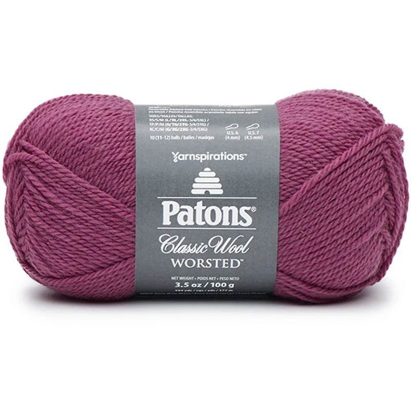 Classic Wool Worsted signé Patons est un fil doux de qualité supérieure, fait à partir de laine à 100 %. Avec son poids polyvalent et sa large gamme de couleurs, il est parfait pour les vêtements, les accessoires et les projets de déco intérieure.Caractéristiques :Composition : 100 % laineEntretien : laver à la main, ne pas blanchir, ne pas nettoyer à sec, ne pas repasser, sécher à platPoids : 100 g/3,5 ozLongueur : 177 m/194 vergesJauge : 4 peigné Tricot : 26 rangs x 20 m = 10 x 10 cm (4 x 4 po)Crochet : 17 rangs x 14 ms = 10 x 10 cm (4 x 4 po)Aiguille (tricot) : 4,5 mmAiguille (crochet) : 5 mm